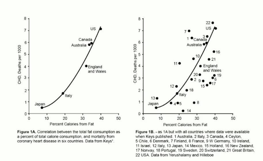 Die Seven-Country-Study aus den 60ern hat an 12.000 mittelalten Männern den Effekt von Nahrungsfett auf die Gesundheit untersucht. Die Nahrungsfettaufnahme korrelierte positiv mit der Sterberate der Studienteilnehmer (siehe Abbildung 1 linkes Diagramm). Bereits damals haben sich Kritiker dieser Studienergebnisse zu Wort gemeldet und eine Gegenanalyse mit Datenergänzung aus weiteren Ländern dieser Welt publiziert (siehe Abbildung 1 rechtes Diagramm).