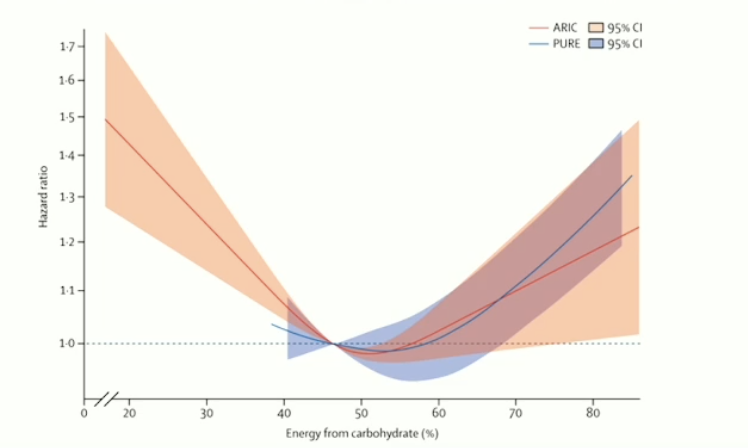 Abbildung 2: Dargestellt ist die Assoziation zwischen Kohlenhydratzufuhr und Mortalitätsrisiko. Das Optimum liegt bei etwa 50 Energieprozent.1
