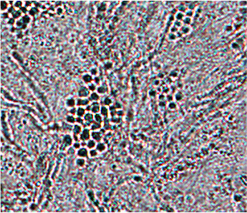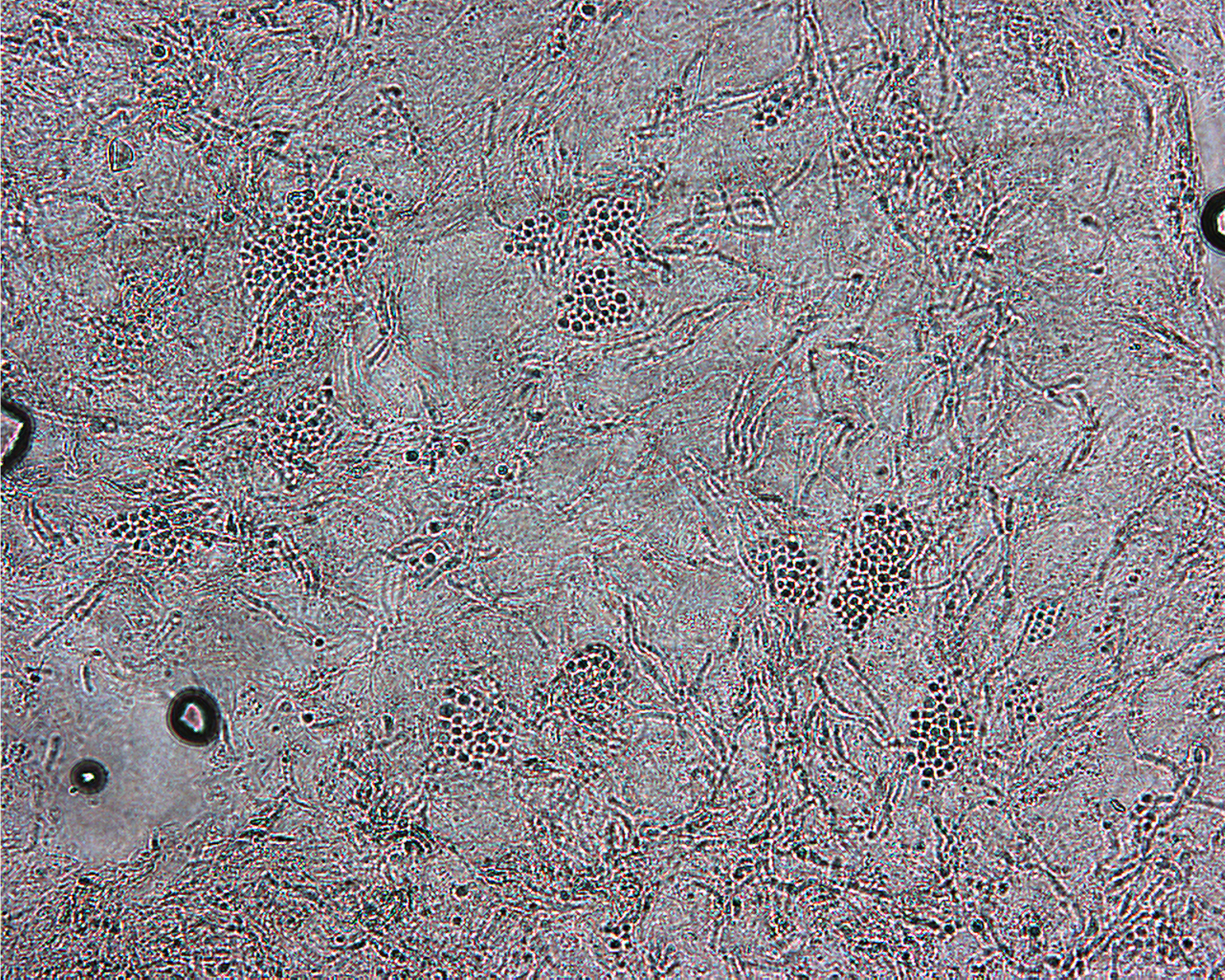 Im Tesaabrisspräparat in Methylenblaufärbung werden Hyphen und Sporenhaufen sichtbar (sogenannter Aspekt der "Spaghetti und Fleischbällchen") (Abb. 7,8).