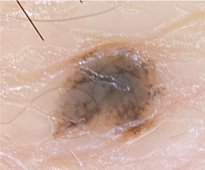 In der Dermatoskopie zeigt die kleinere melanozytäre Läsion ein scholliges schwärzliches, teils hyalin verstrichenes Pigment. Ferner finden sich streifige Ausläufer. Die Umgebung erscheint homogen und ganz diskret bräunlich (Abb. 3,4).