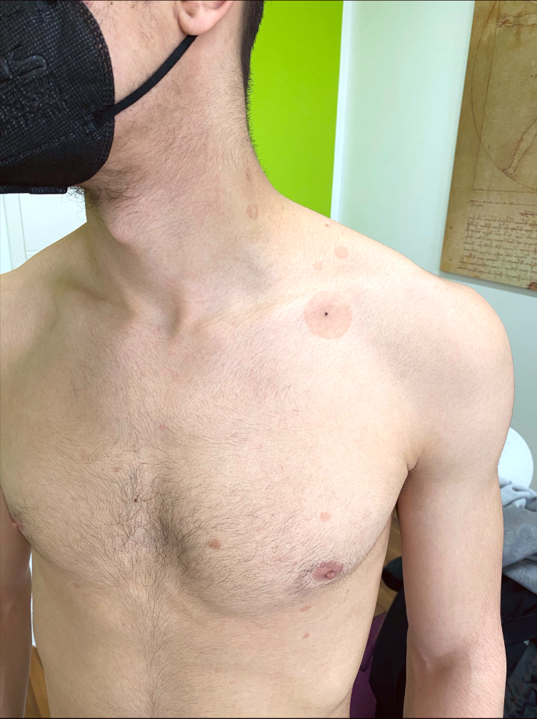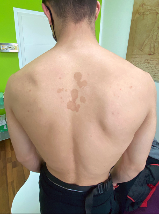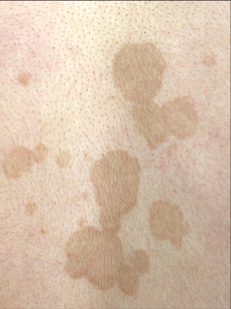 Ähnliche, ebenso scharf begrenzte, bis 4 cm große, rundlich bis ovale hellbraune Maculae finden sich auch an der linken Schulter und deutlicher ausgeprägt paravertebral im Bereich des mittleren Rückens (Abb 5,6).