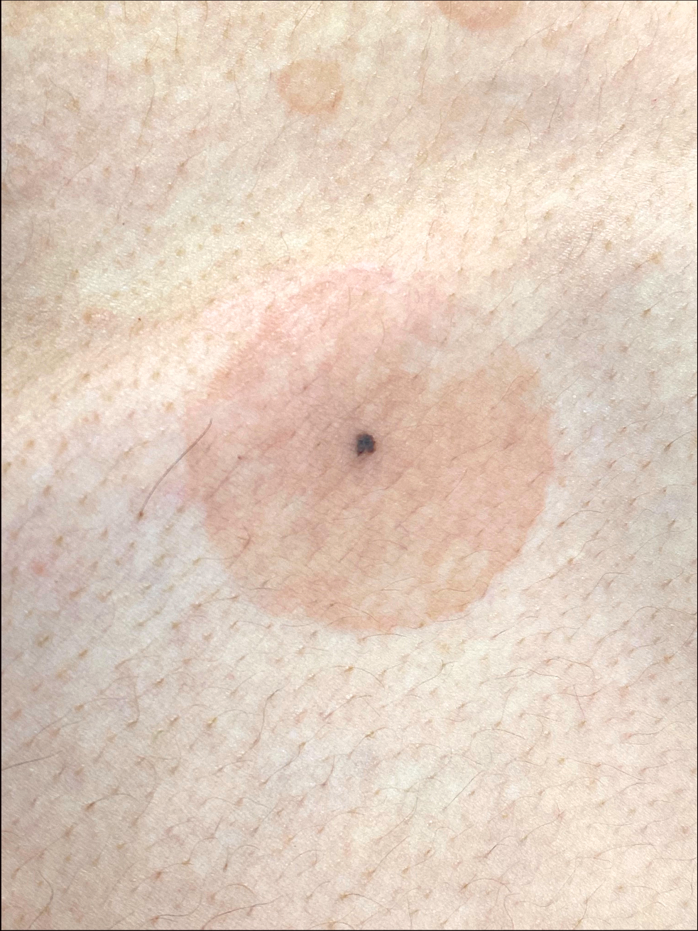 Im vorliegenden Fall kommt es zu einem zufälligen Aufeinandertreffen zweier separater Diagnosen: Zum einen besteht eine Pityriasis versicolor, die sich hier mit auffällig großen Einzelherden, aber doch typisch im Bereich der seborrhoischen Areale manifestiert. Dies konnte durch den Nachweis der typischen Pilzelemente in der Tesaabriss-Mikroskopie bewiesen werden. Durch das Auftreten eines melanozytären Nävus mitten im Zentrum dieser kreisförmigen Läsion wurde ein "Halo"-Aspekt vorgetäuscht. Ein Halonävus allerdings ist ein benigner melanozytärer Nävus der von einem depigmentierten hellen Hautring umgeben ist und der oft bei Vitiligo auftritt. Man vermutet eine melanozytentoxische Autoimmunreaktion.