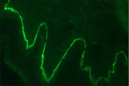 Die großen, stabilen serösen Spannungsblasen sowie die anamnestisch bestätigten, bereits länger bestehenden Hautläsionen am unteren Rumpf und den proximalen Extremitäten bei einer älteren Patientin deuteten schon vor Vorliegen der paraklinischen und bioptischen Diagnostikergebnisse stark auf ein bullöses Pemphigoid (BP) hin. Rückblickend charakteristisch sind die der Blaseneruption vorausgegangenen Hautläsionen, die zumeist ekzematös und urtikariell anmuten und als "prämonitorisches Erythem“ der Blasenbildung Monate bis Jahre vorangehen können. Die Verdachtsdiagnose BP wurde autoimmunserologisch, histologisch und durch die direkte Immunfluoreszenz bestätigt.