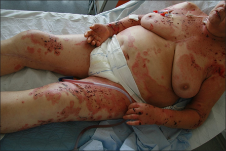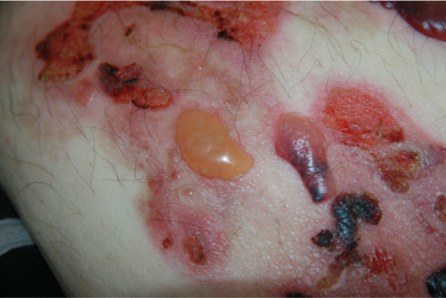 Abb. 3: 75-jährige Patientin mit großflächig manifestiertem bullösem Pemphigoid, hier wird neben den teils hämorrhagischen Spannungsblasen auch die der Blasenbildung vorausgehenden teils ekzematös teils urtikarielle Hautläsionen sichtbar (a,b).