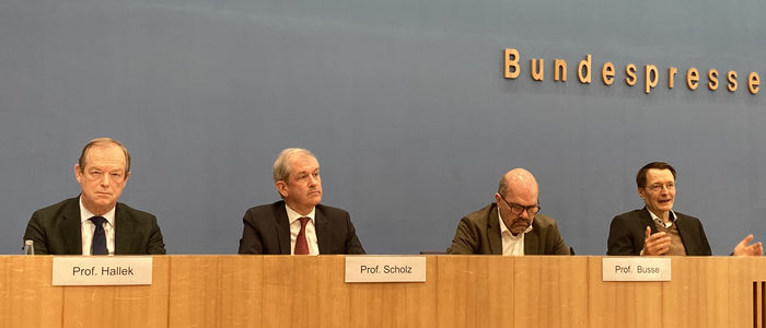 Qualitätstransparenz für Kliniken ist notwendig und möglich: Bundesgesundheitsminister Karl Lauterbach (rechts) am Dienstag vor der Bundespressekonferenz mit den Professoren Michael Hallek, Vorsitzender des Gesundheits-Sachverständigenrates, Jens Scholz, Vorsitzender des Verbandes der Universitätsklinika, und Reinhard Busse, Gesundheitsökonom an der TU Berlin.