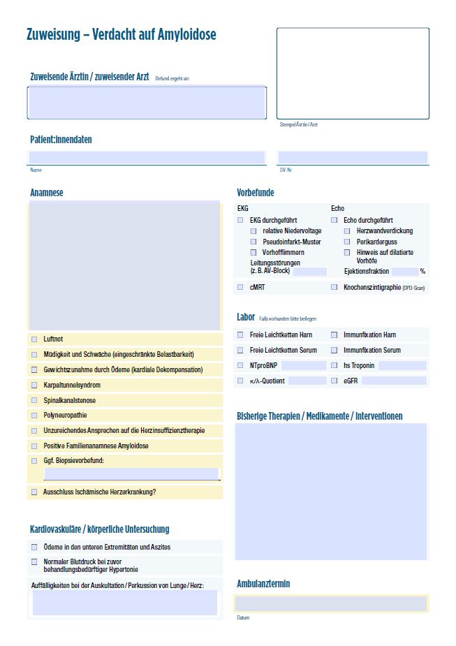 Hausärztinnen und -ärzte in ihrer guten Kooperation mit kardiologischen Praxen oder Kliniken kommt somit eine entscheidende Rolle hinsichtlich einer möglichst raschen Diagnose und Therapie der ATTR-CM zu. Um Patient:innen mit Verdacht auf eine ATTR-CM schnell und einfach in die Kardiologie überweisen zu können, gibt es einen Zuweiserbogen, der alle notwendigen Angaben beinhaltet.10 Sie können diesen hier herunterladen.