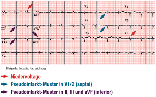 - absolute Niedervoltage (QRS < 0,5 mV in Extremitätenableitungen und< 1 mV in Brustwandableitungen) bei etwa 30 %