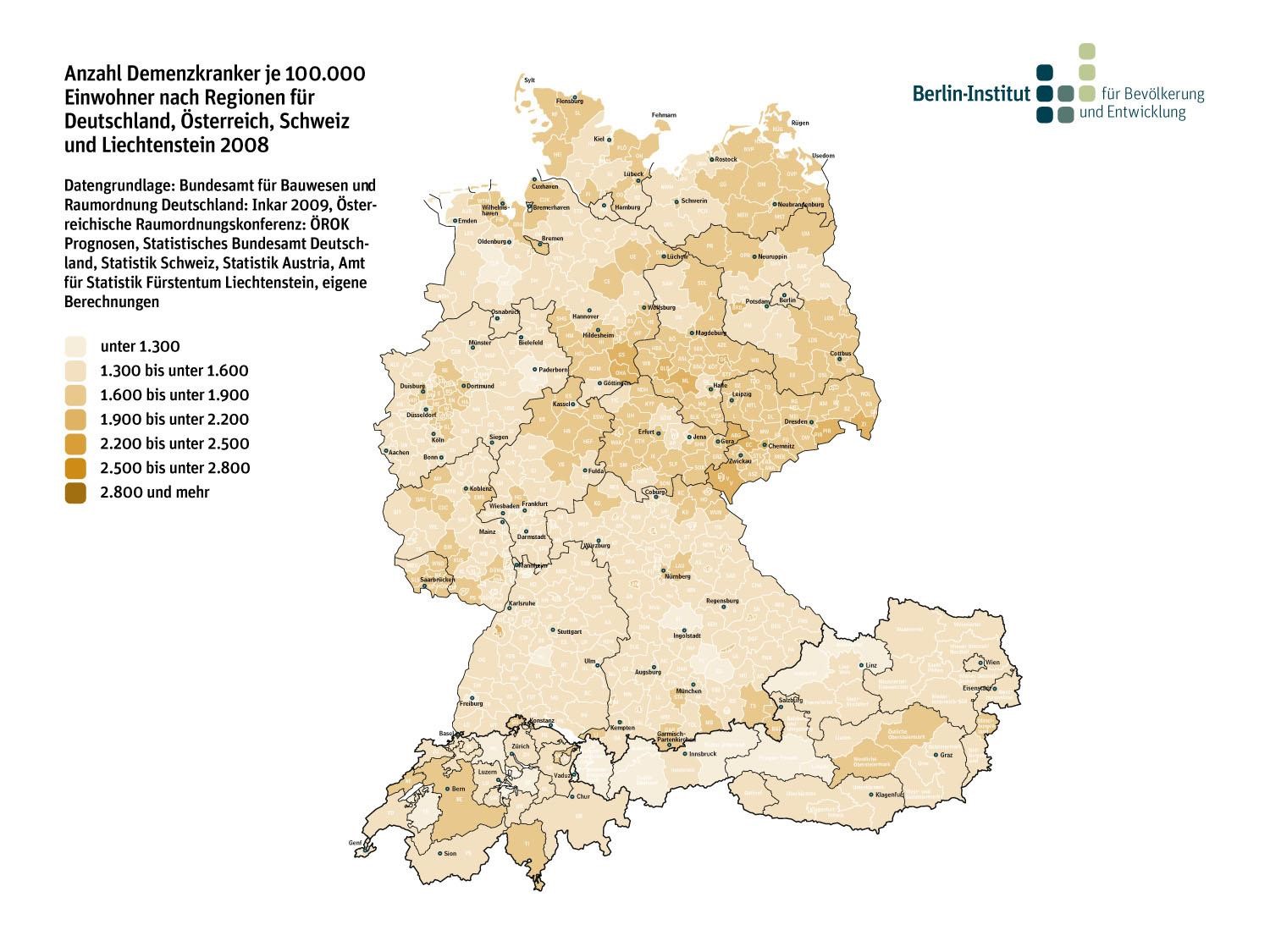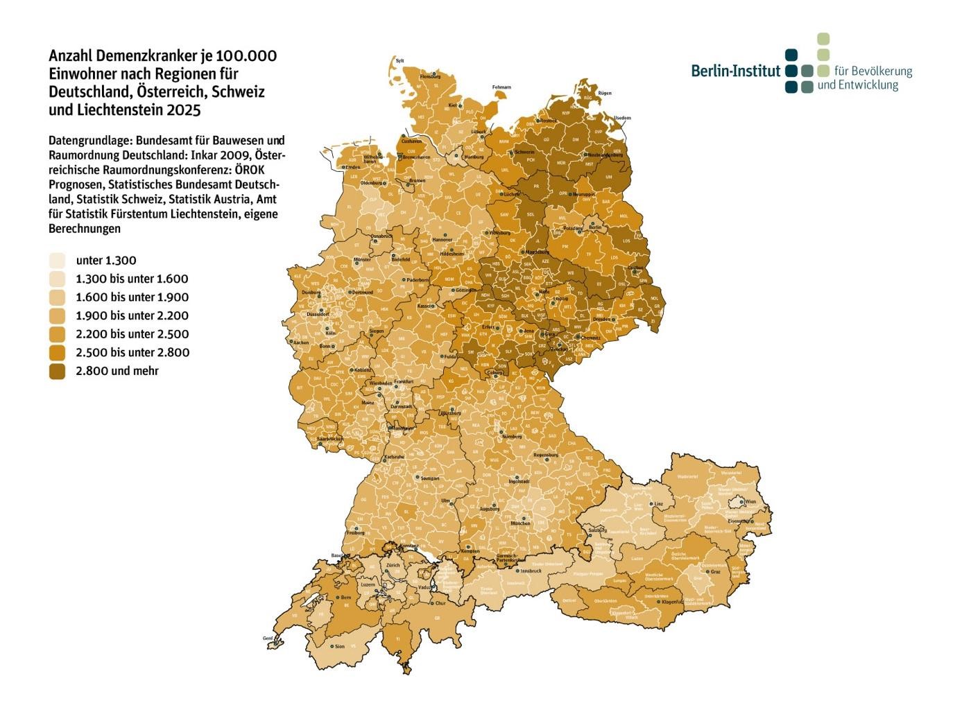 Peters weist auf die große Bedeutung der Demenz in Deutschland hin und führt dem Auditorium die "Landkarten der Demenz" des Berlin-Instituts vor Augen1. Das Berlin-Institut hat in einer Studie untersucht, wie sich u. a. verschiedene Regionen Deutschlands auf die Alterung der Gesellschaft vorbereiten können. Der Anteil der Menschen mit Demenz an der Gesamtbevölkerung liegt aktuell bei rund 1.600 je 100.000 Einwohner. Dem Berlin-Institut zufolge könnte sich diese Zahl in den kommenden dreißig Jahre sogar verdoppeln. Betrachtet man die Deutschlandkarte des Demenz Reports Berlin-Instituts2, so fällt auf, dass die es regionale Unterschiede hinsichtlich der Prävalenz der Demenz gibt.
