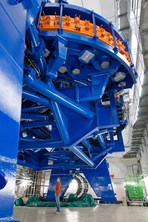 ©GSI - Die rotierende "Gantry" (blau) in Heidelberg ist ebenso beeindruckend. Sie trägt einen Teil des Kohlenstoff-Ionen-Beschleunigers (orange), sodass sich der Strahl um den Patienten im Behandlungsraum drehen kann (hier nicht sichtbar).